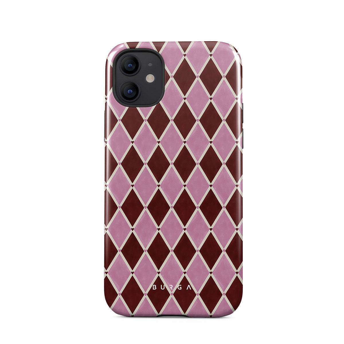 Den här stilen har: harlekinmönster, rosa diamanter, djupröd bakgrund
