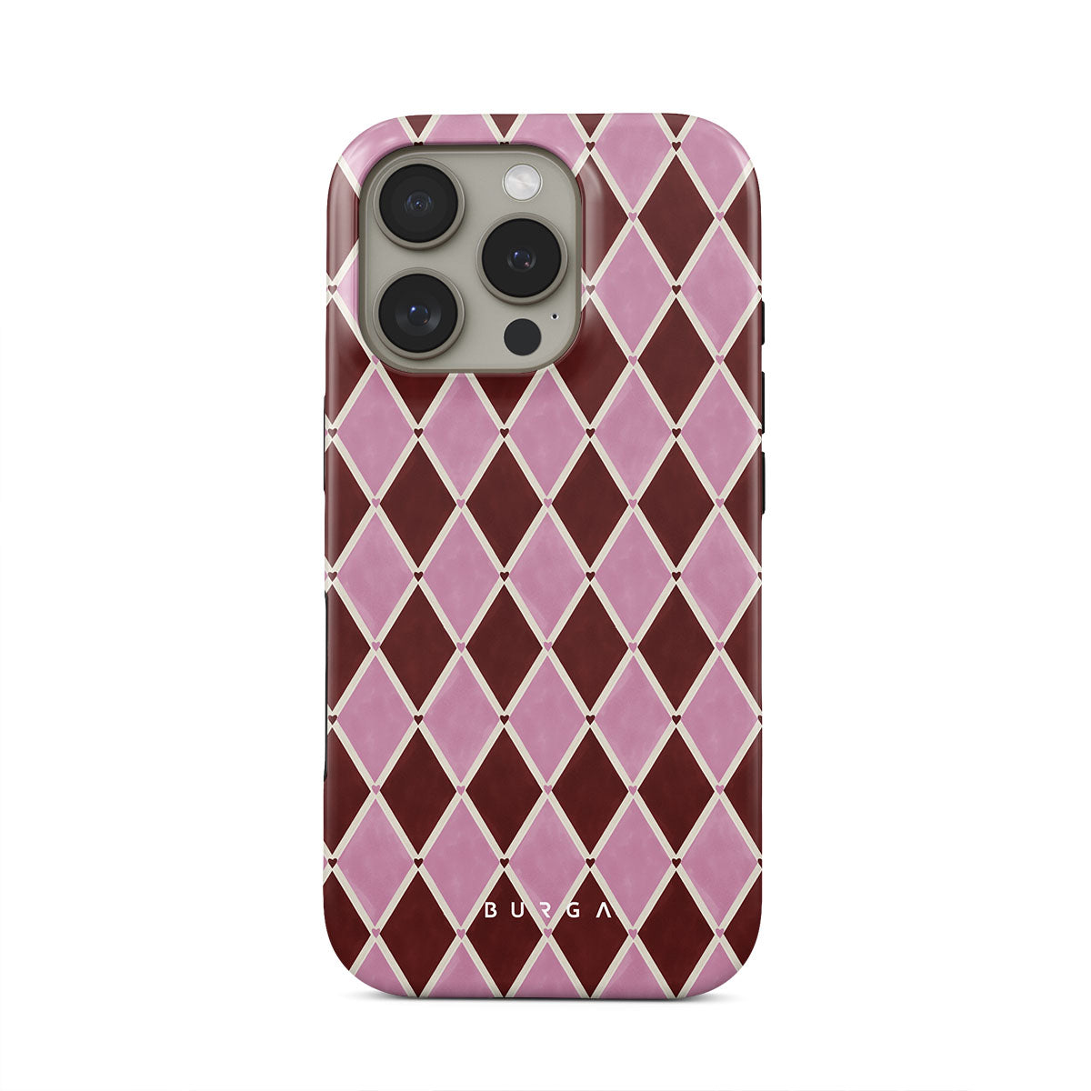 Den här stilen har: harlekinmönster, rosa diamanter, djupröd bakgrund