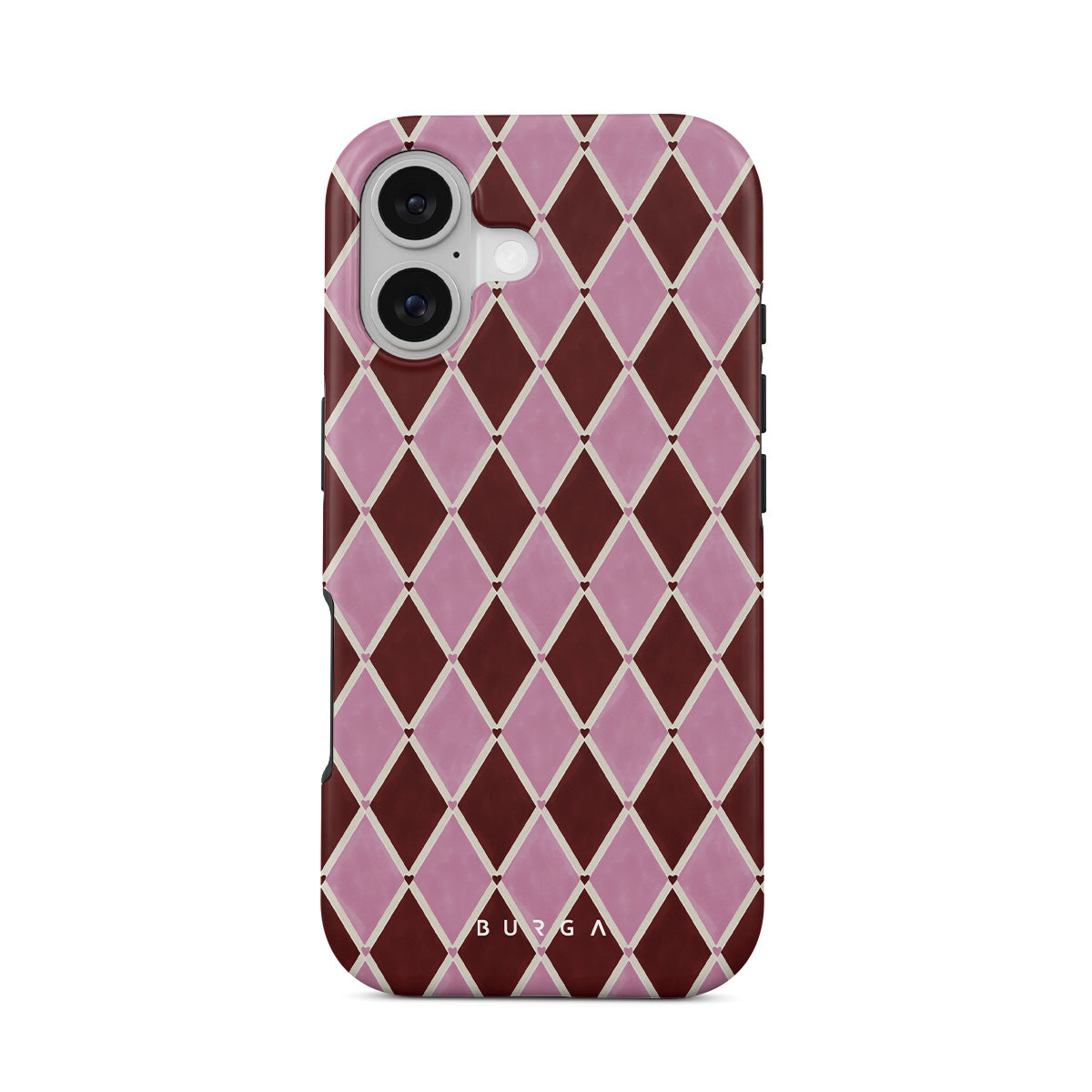 Den här stilen har: harlekinmönster, rosa diamanter, djupröd bakgrund