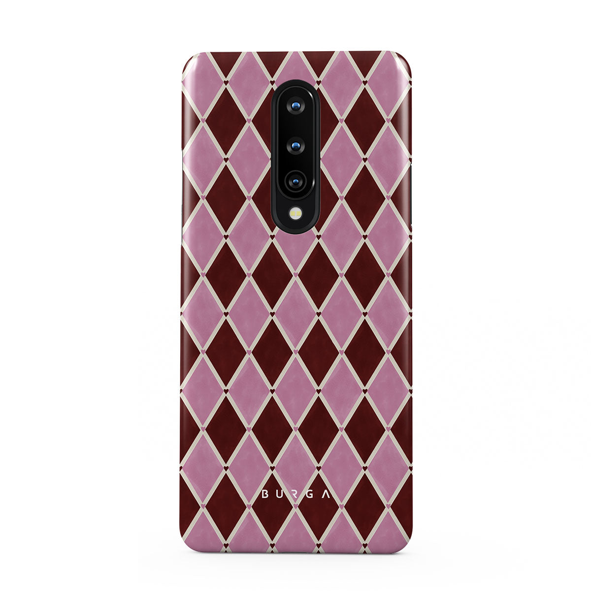 Den här stilen har: harlekinmönster, rosa diamanter, djupröd bakgrund