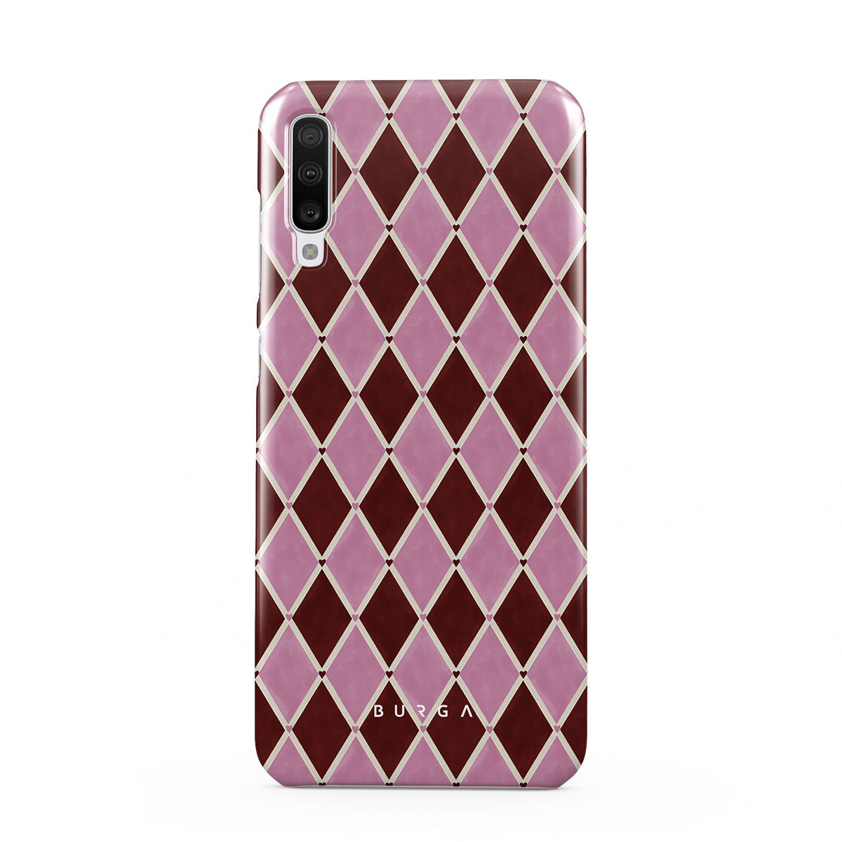 Den här stilen har: harlekinmönster, rosa diamanter, djupröd bakgrund