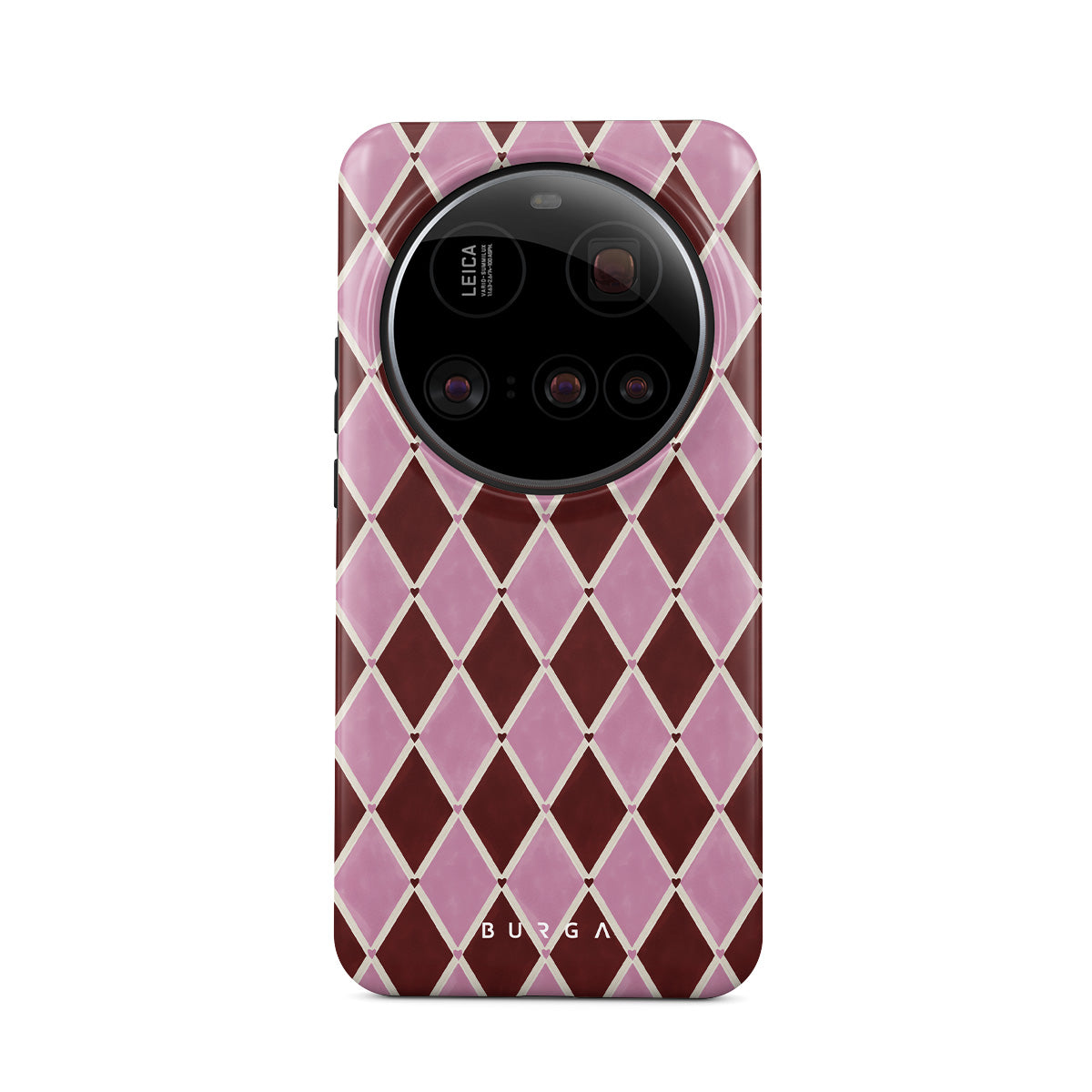 Den här stilen har: harlekinmönster, rosa diamanter, djupröd bakgrund