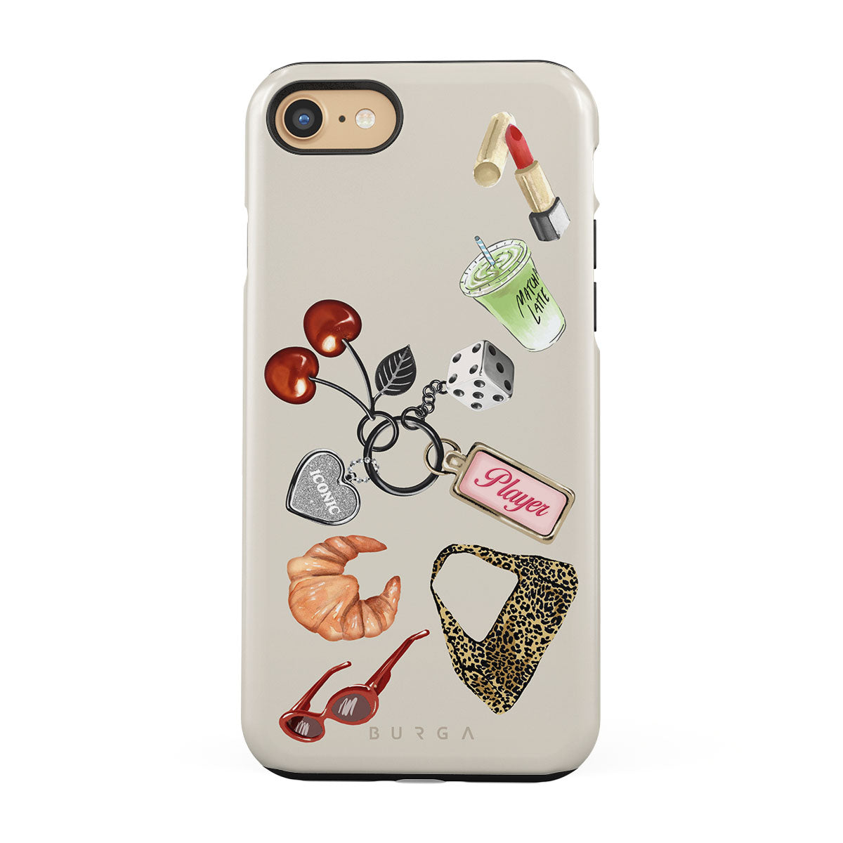 Den här stilen har: röda solglasögon, rött läppstift, grön matcha-dryck, croissant, svarta tärningar, leopardmönstrad väska, nyckelring med silverhjärta, körsbär, tärningar och "Player"-tag.