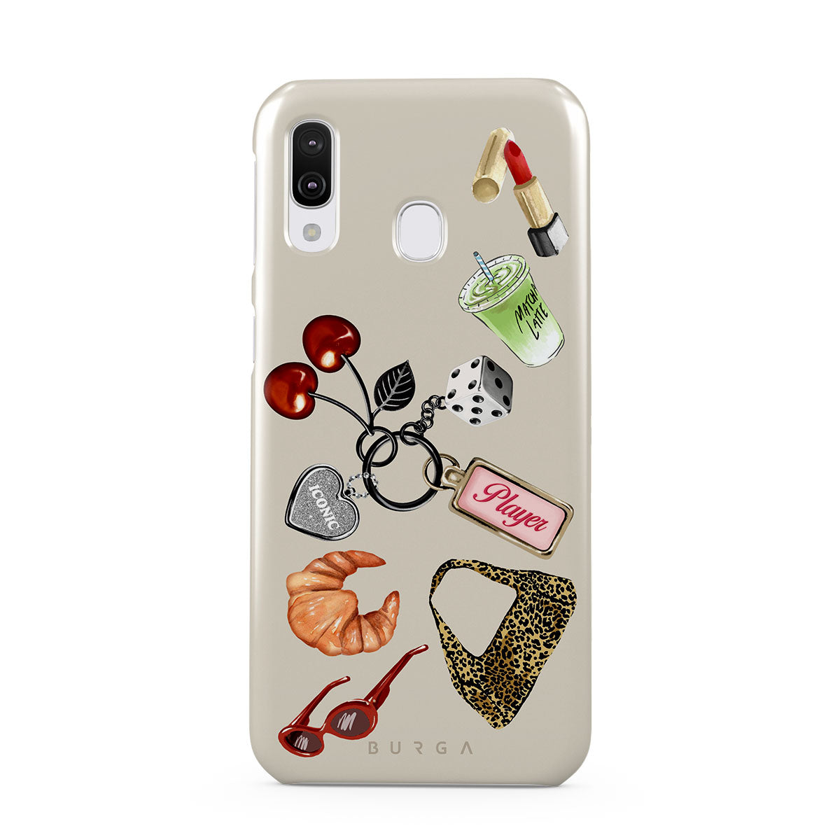 Den här stilen har: röda solglasögon, rött läppstift, grön matcha-dryck, croissant, svarta tärningar, leopardmönstrad väska, nyckelring med silverhjärta, körsbär, tärningar och "Player"-tag.