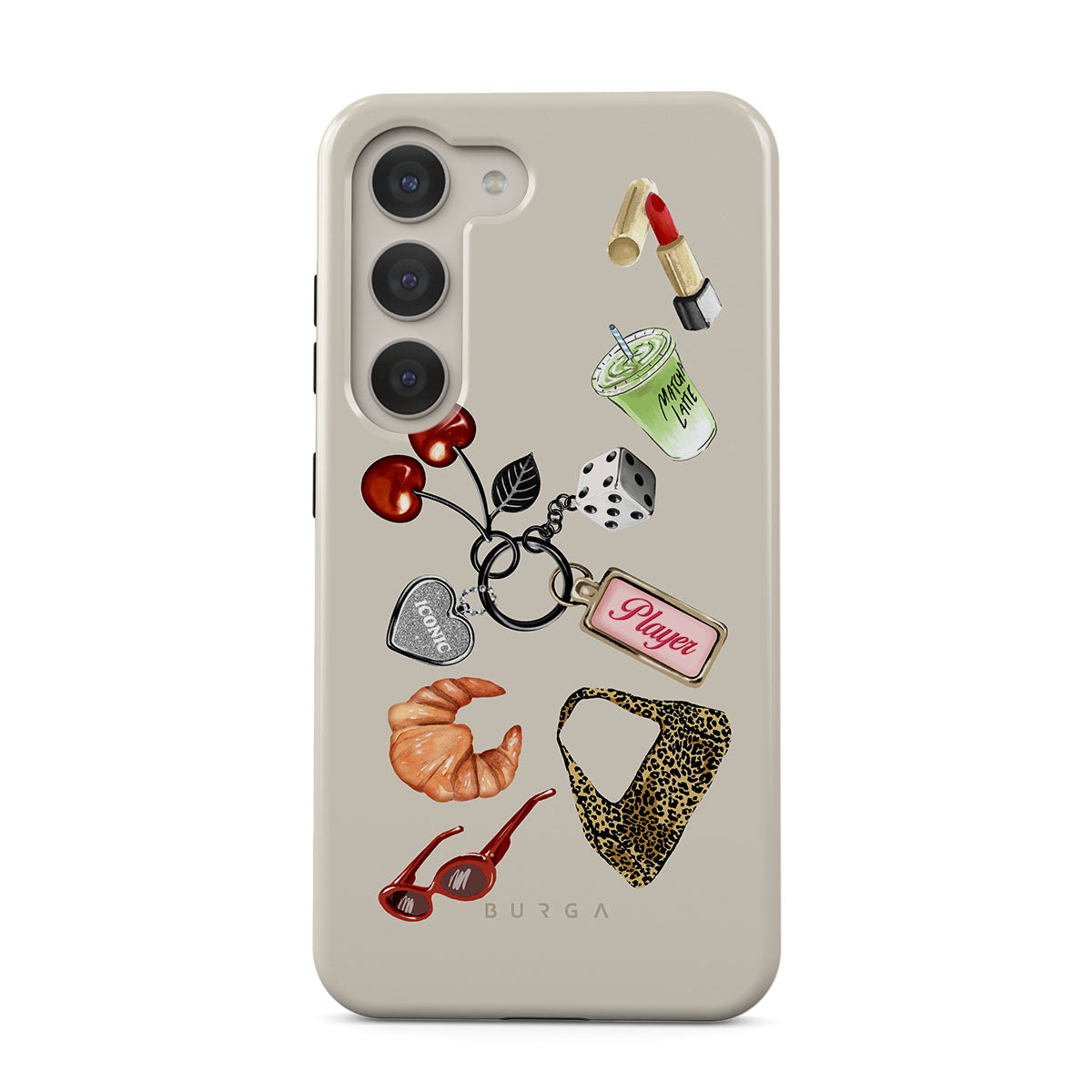 Den här stilen har: röda solglasögon, rött läppstift, grön matcha-dryck, croissant, svarta tärningar, leopardmönstrad väska, nyckelring med silverhjärta, körsbär, tärningar och "Player"-tag.