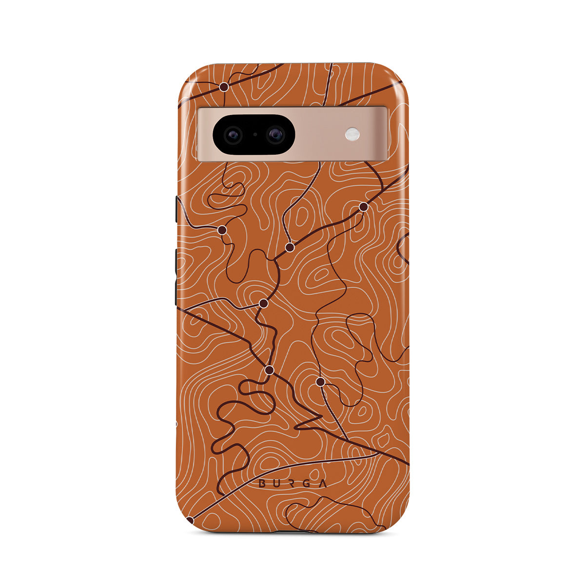 Denna design har: orange, kartlinjer, abstrakt mönster