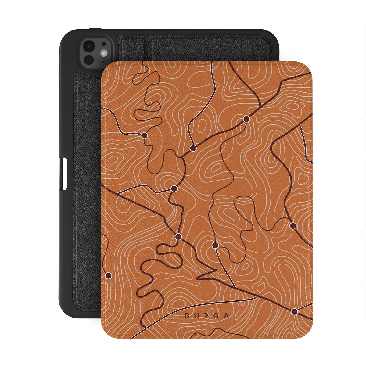 Denna design har: orange, kartlinjer, abstrakt mönster