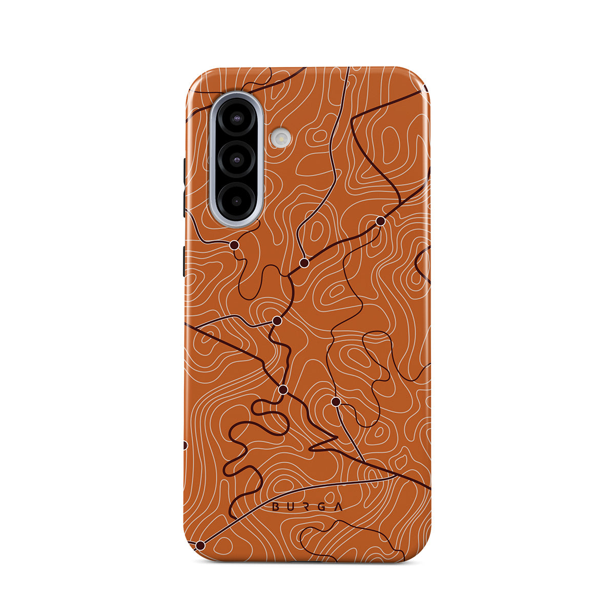 Denna design har: orange, kartlinjer, abstrakt mönster