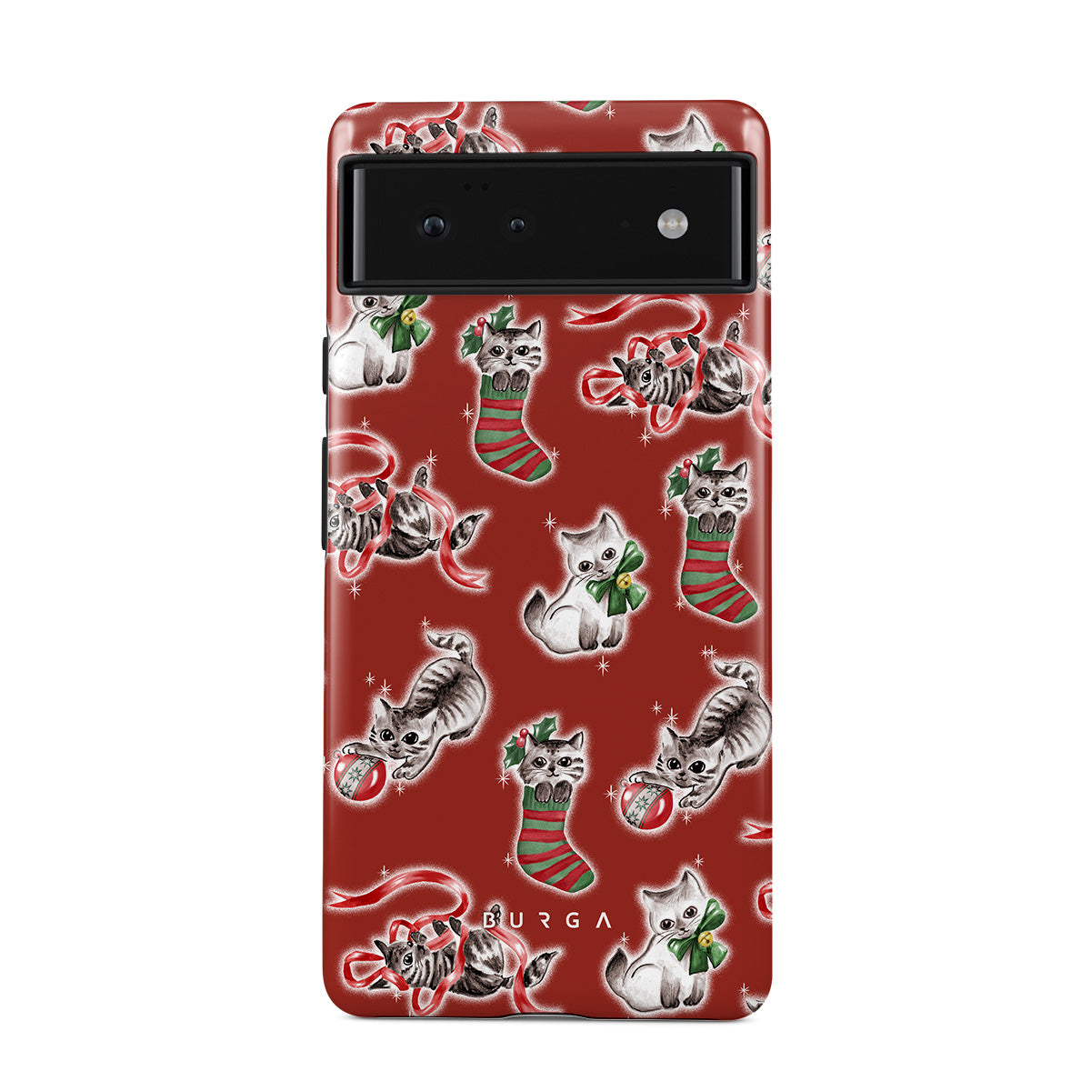 Denna design har: katter, julstrumpor, kattungar, röd och grön mönster, lekfulla katter, juldekorationer