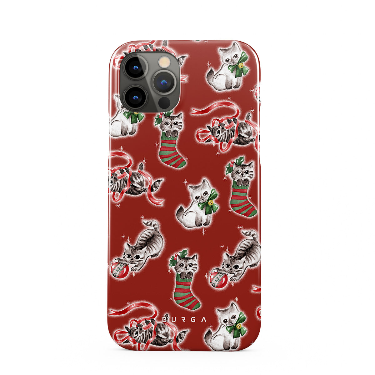 Denna design har: katter, julstrumpor, kattungar, röd och grön mönster, lekfulla katter, juldekorationer