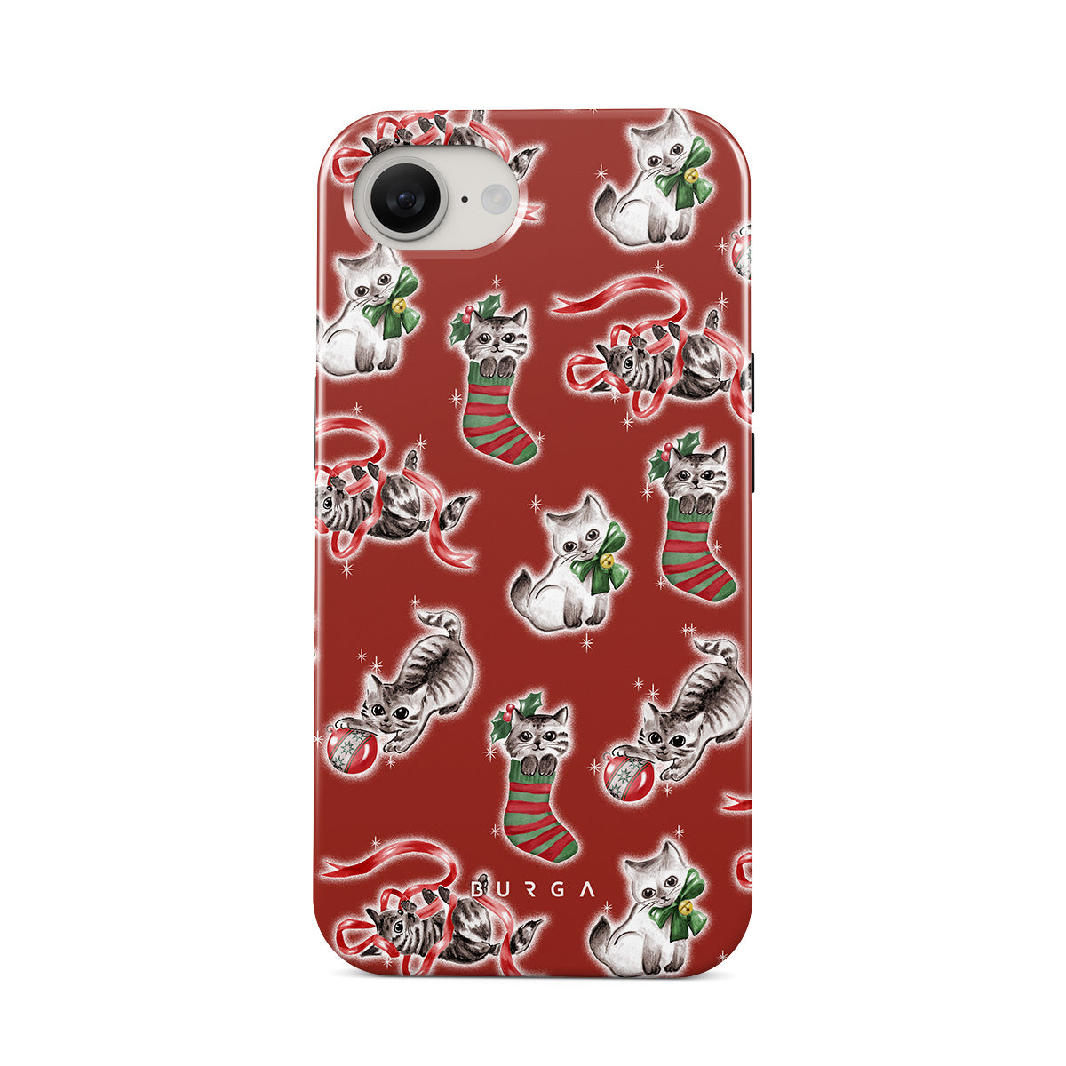 Denna design har: katter, julstrumpor, kattungar, röd och grön mönster, lekfulla katter, juldekorationer