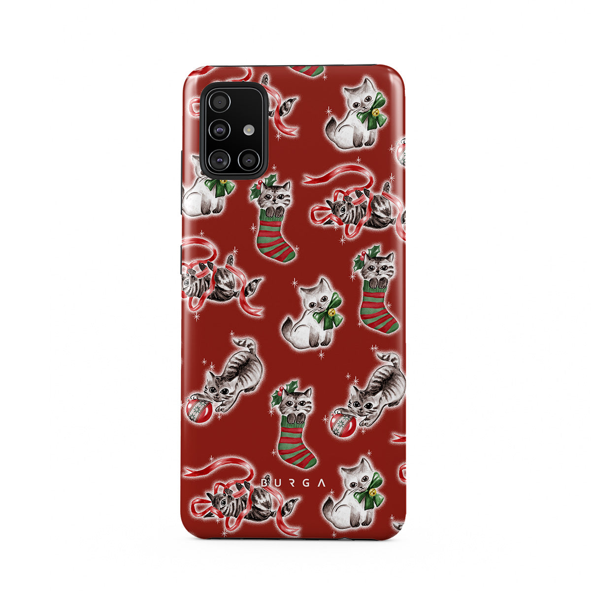 Denna design har: katter, julstrumpor, kattungar, röd och grön mönster, lekfulla katter, juldekorationer