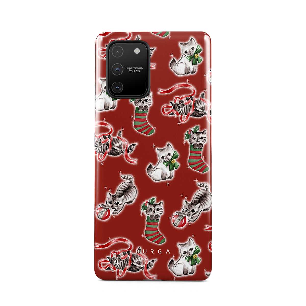 Denna design har: katter, julstrumpor, kattungar, röd och grön mönster, lekfulla katter, juldekorationer