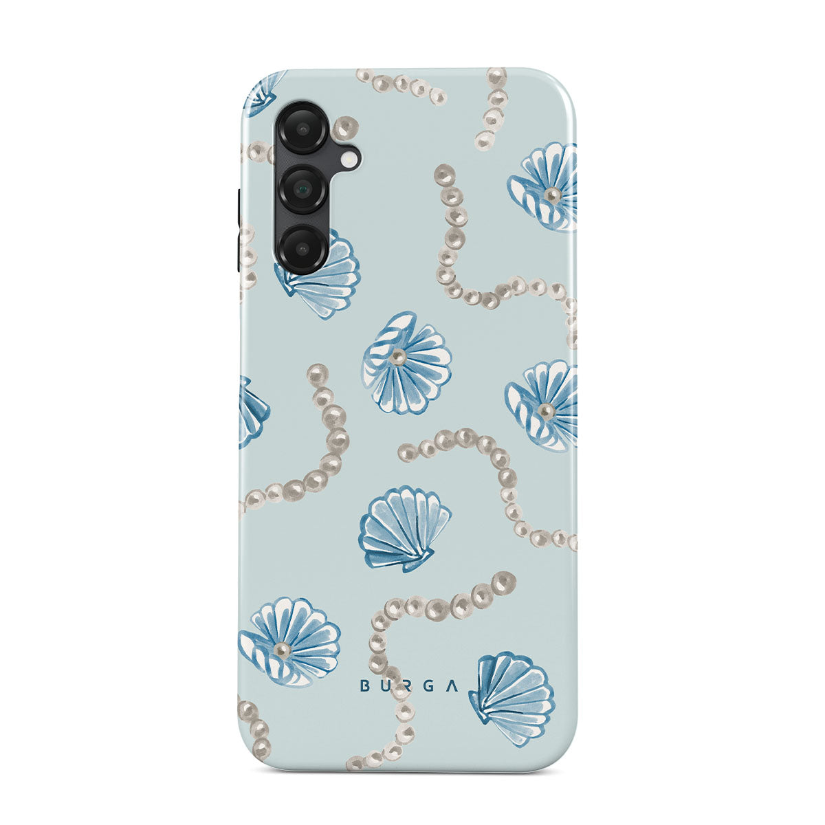 Den här stilen har: pärlor, snäckor, ljusblå bakgrund, havselement.