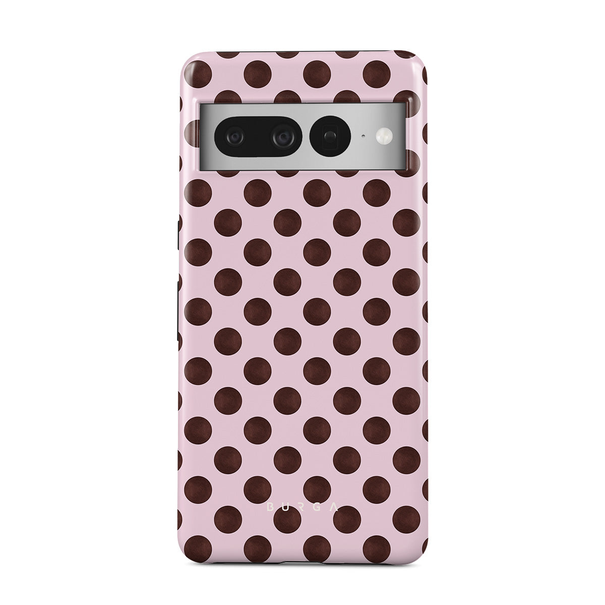 Den här stilen har: ett retro prickmönster, rosa bakgrund med bruna prickar.