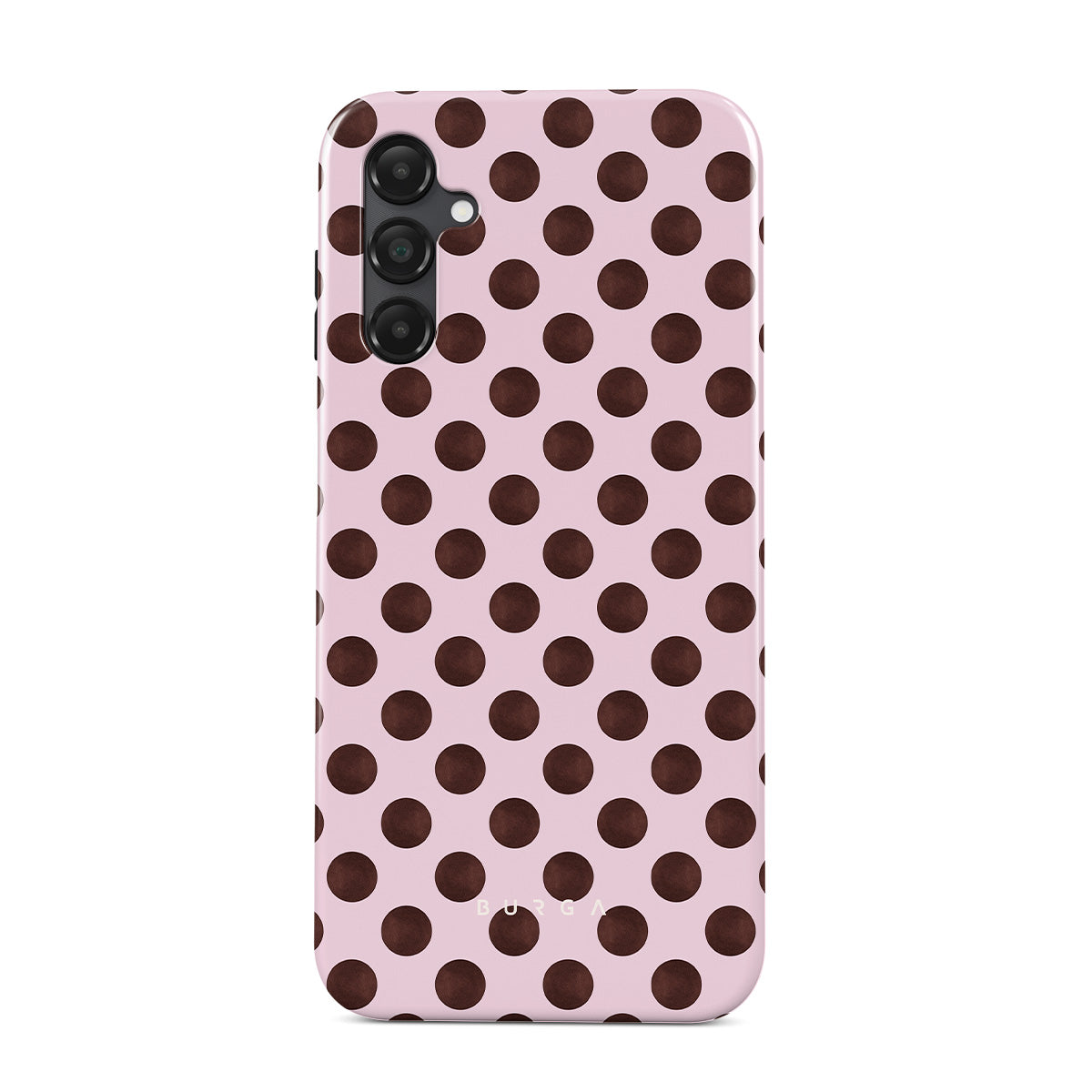 Den här stilen har: ett retro prickmönster, rosa bakgrund med bruna prickar.