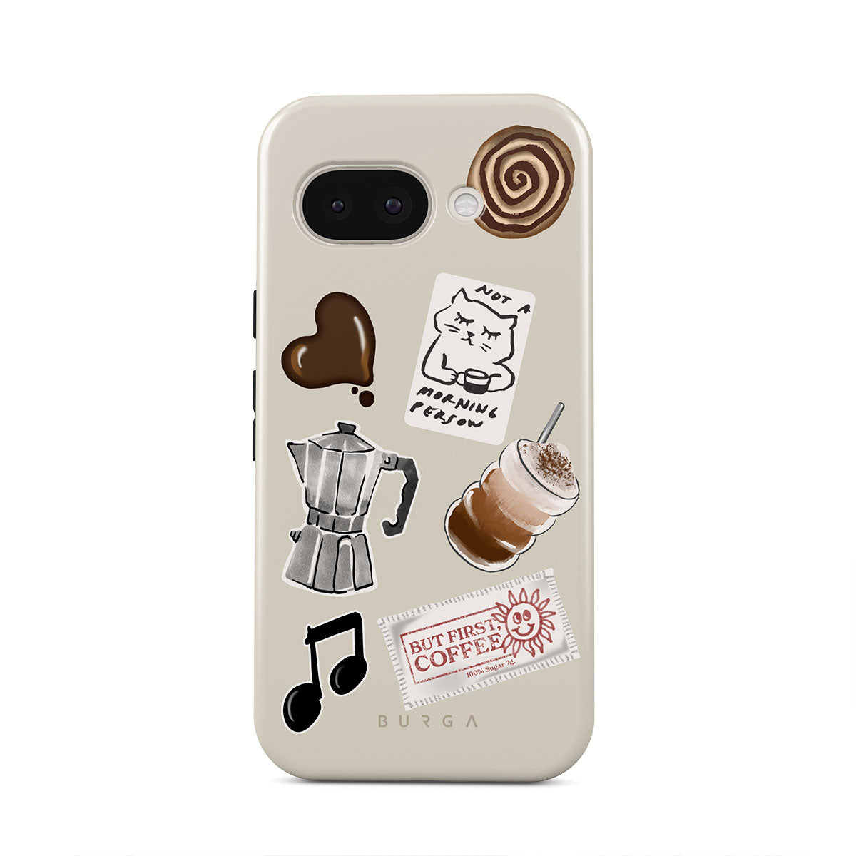 Den här stilen har: mokabryggare, frappé, kanelbulle, chokladhjärta, klistermärke "Not a morning person", kvitto "But First, Coffee", musiknot.
