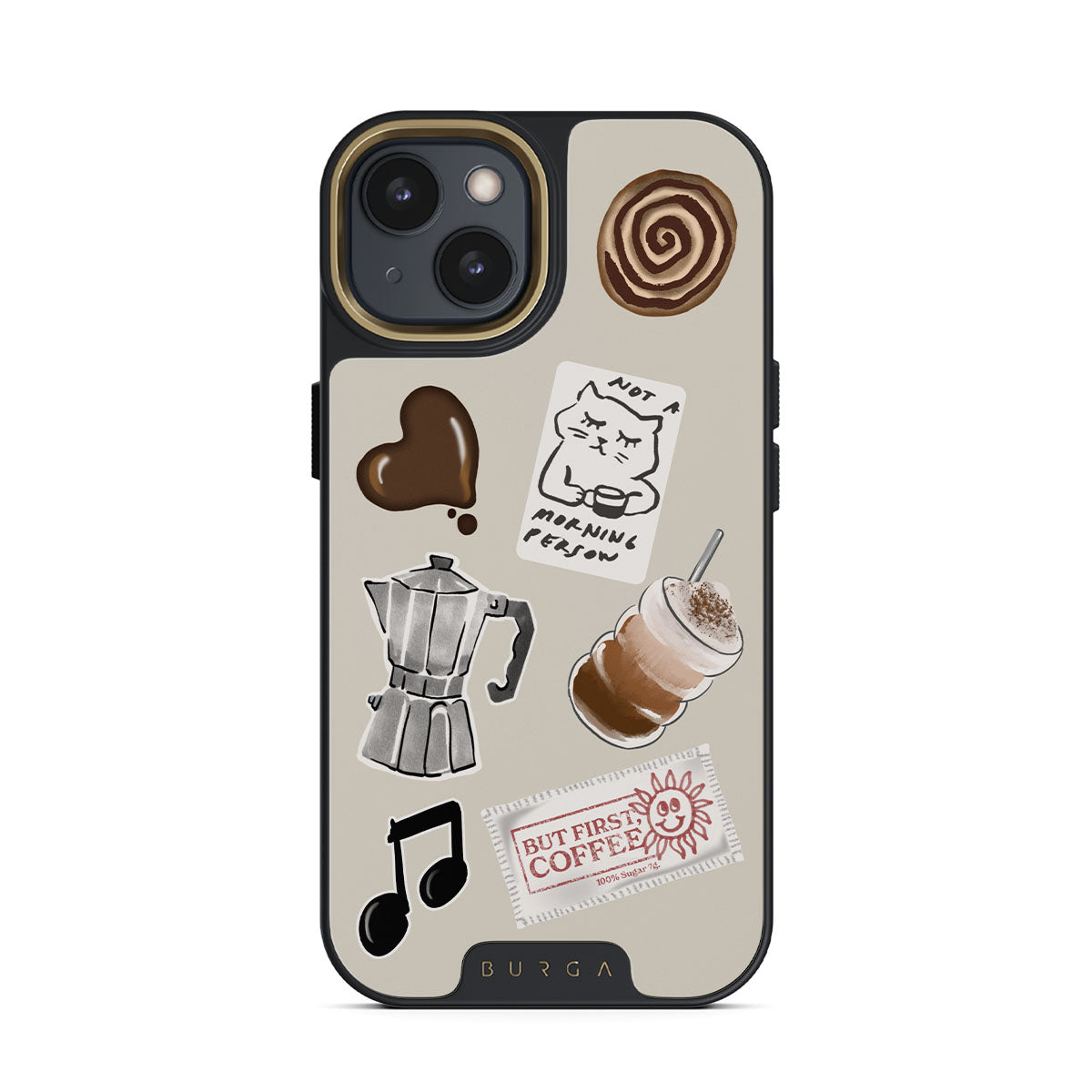 Den här stilen har: mokabryggare, frappé, kanelbulle, chokladhjärta, klistermärke "Not a morning person", kvitto "But First, Coffee", musiknot.