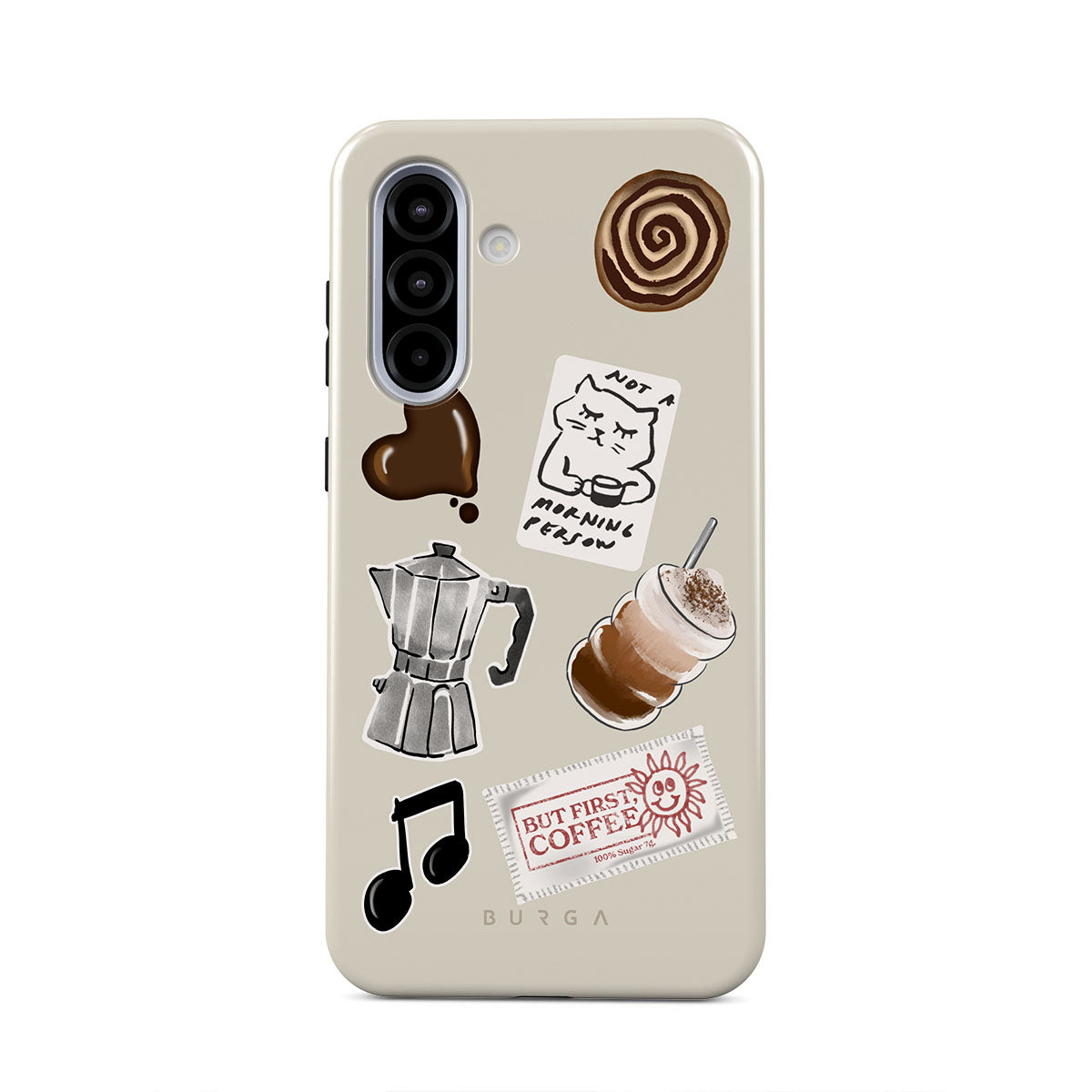 Den här stilen har: mokabryggare, frappé, kanelbulle, chokladhjärta, klistermärke "Not a morning person", kvitto "But First, Coffee", musiknot.