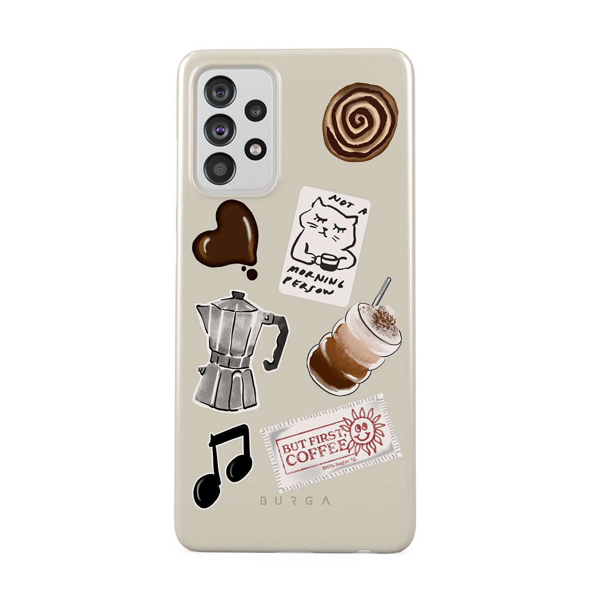 Den här stilen har: mokabryggare, frappé, kanelbulle, chokladhjärta, klistermärke "Not a morning person", kvitto "But First, Coffee", musiknot.