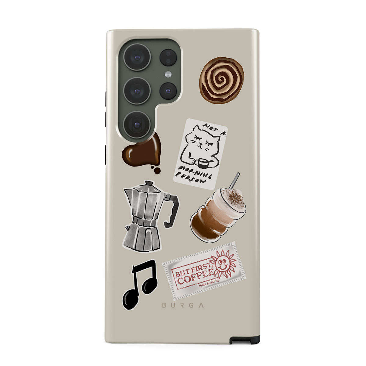 Den här stilen har: mokabryggare, frappé, kanelbulle, chokladhjärta, klistermärke "Not a morning person", kvitto "But First, Coffee", musiknot.