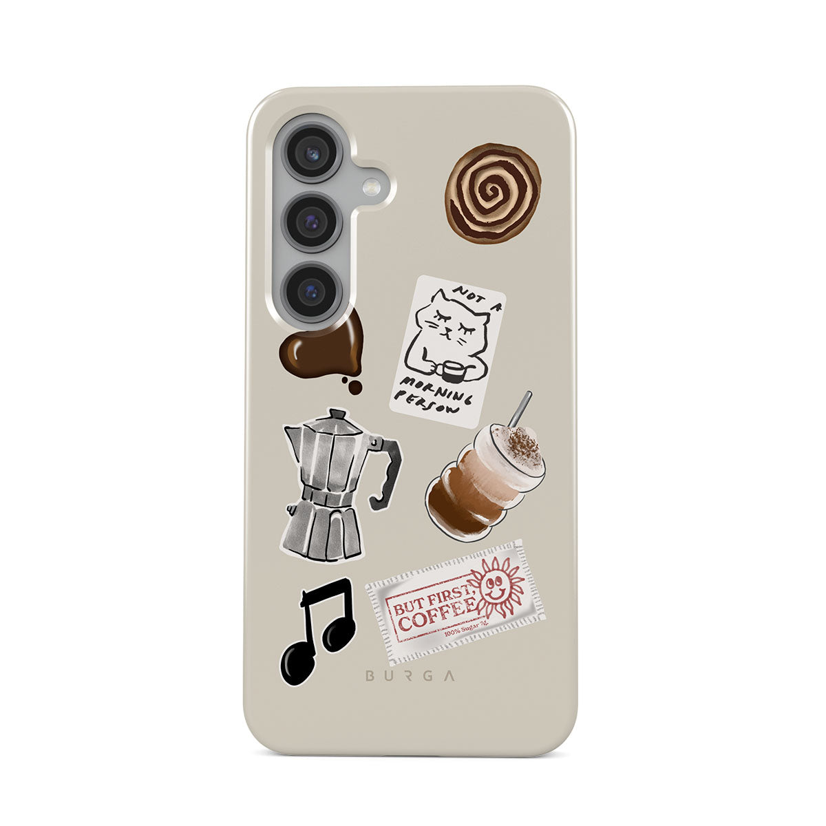 Den här stilen har: mokabryggare, frappé, kanelbulle, chokladhjärta, klistermärke "Not a morning person", kvitto "But First, Coffee", musiknot.