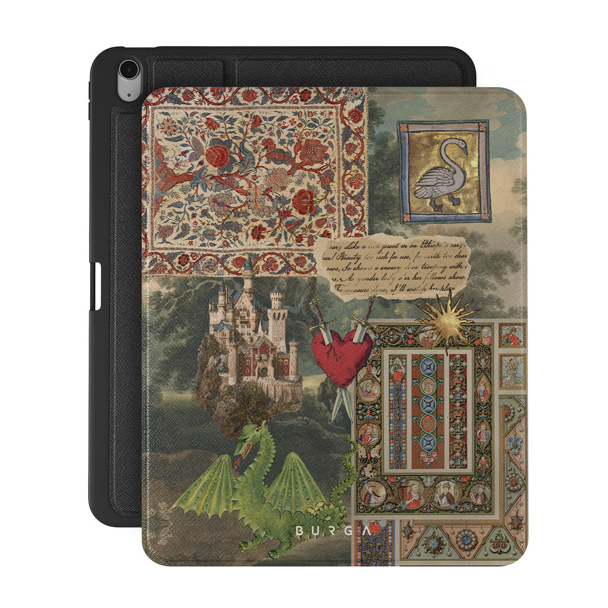 Denna design har: handskriven kalligrafitypsnitt, vintageprint, medeltida design, blommönster, illustrationer från gamla böcker, hjärta, drake, slott