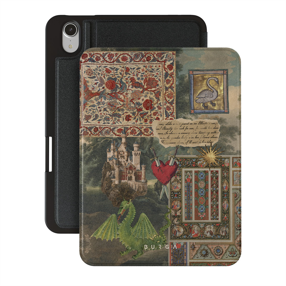 Denna design har: handskriven kalligrafitypsnitt, vintageprint, medeltida design, blommönster, illustrationer från gamla böcker, hjärta, drake, slott