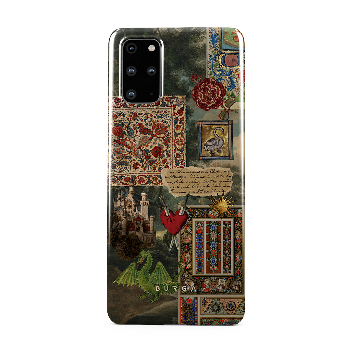 Denna design har: handskriven kalligrafitypsnitt, vintageprint, medeltida design, blommönster, illustrationer från gamla böcker, hjärta, drake, slott