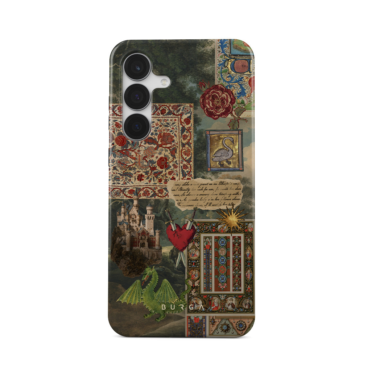 Denna design har: handskriven kalligrafitypsnitt, vintageprint, medeltida design, blommönster, illustrationer från gamla böcker, hjärta, drake, slott