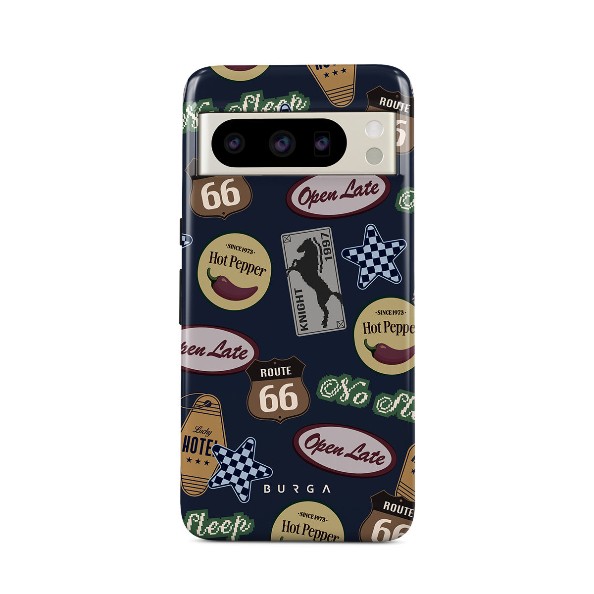 Denna design har: vintageskyltar, retromönster, roadtriptema