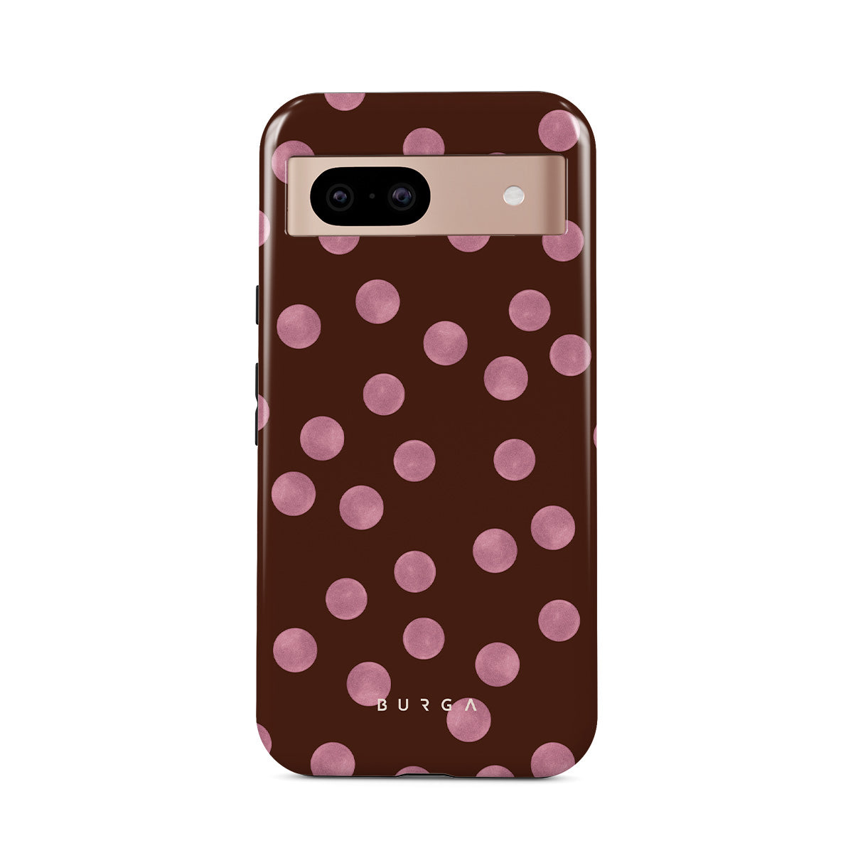 Denna design har: rosa prickar, brun bakgrund, prickmönster
