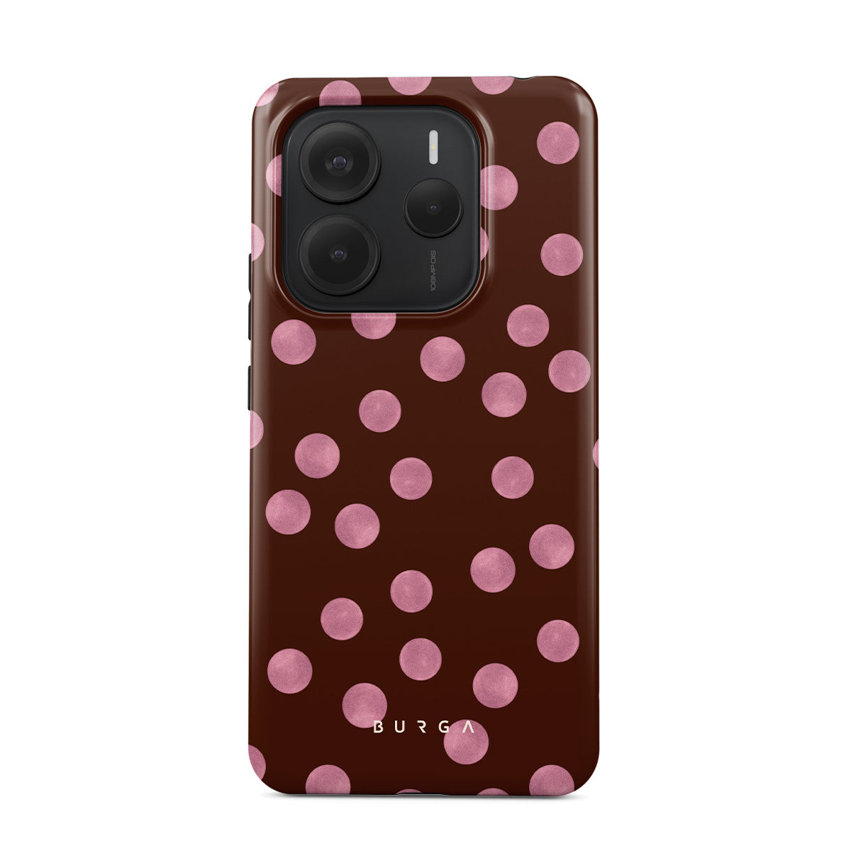 Denna design har: rosa prickar, brun bakgrund, prickmönster