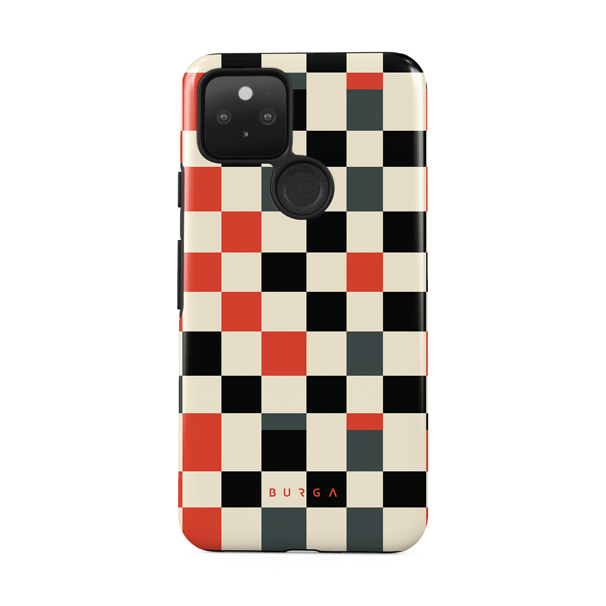 Denna design har: rutmönster, orange, svart, grått, vitt, geometriskt mönster