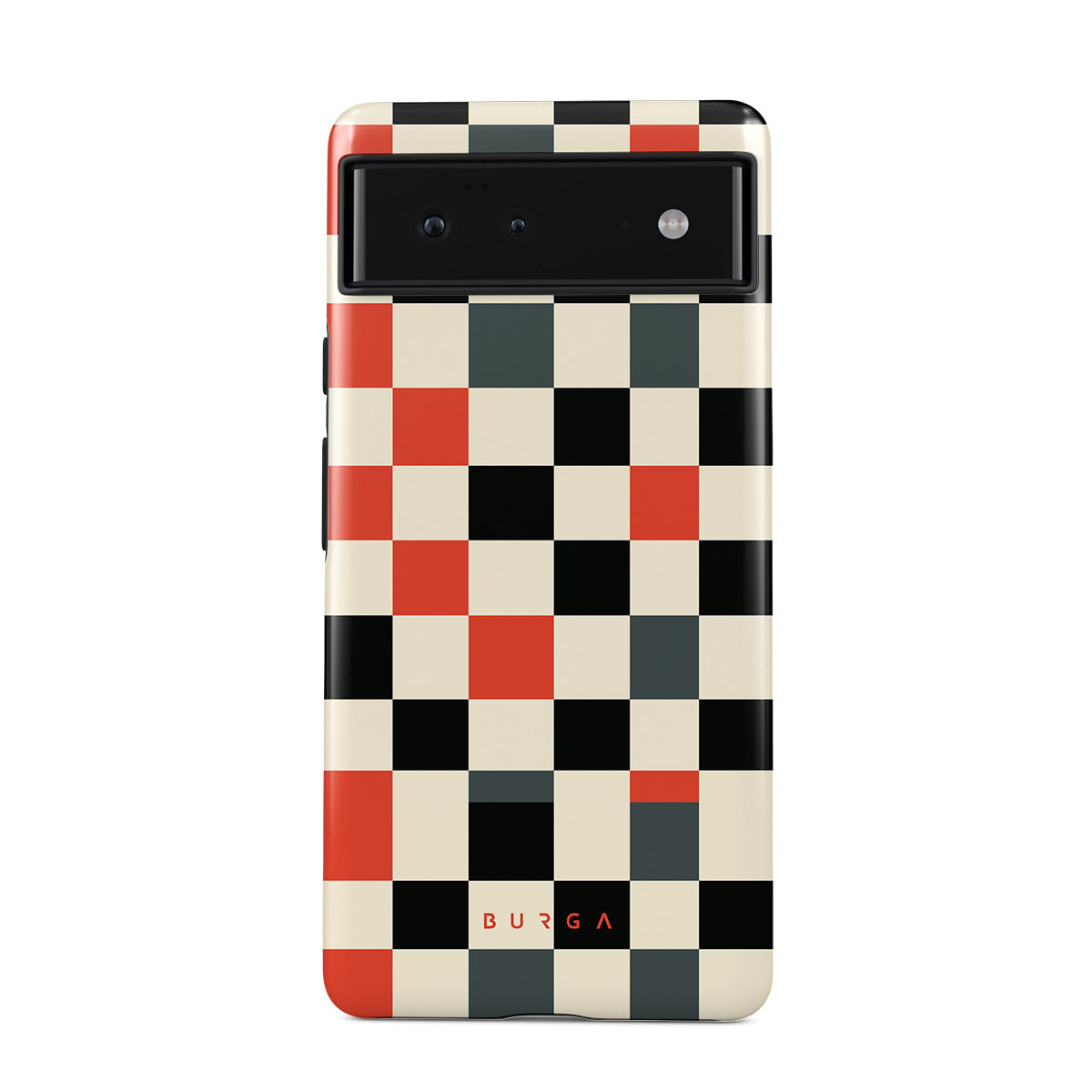 Denna design har: rutmönster, orange, svart, grått, vitt, geometriskt mönster