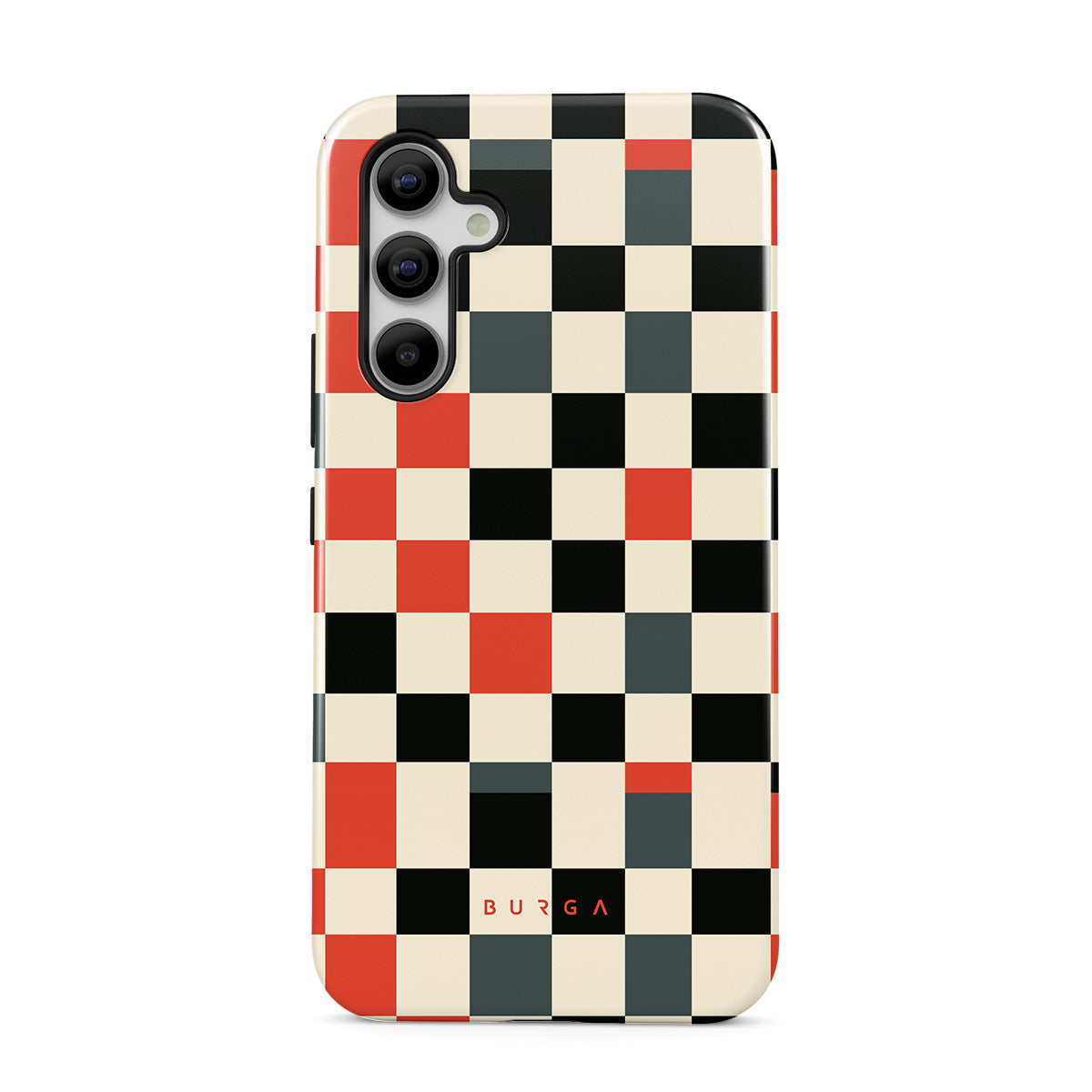 Denna design har: rutmönster, orange, svart, grått, vitt, geometriskt mönster