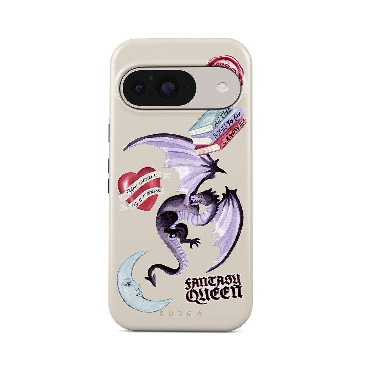Den här stilen har: lila drake, klistermärke "Fantasy Queen", halvmåne, lila sigill, hjärta med meddelande, böcker.