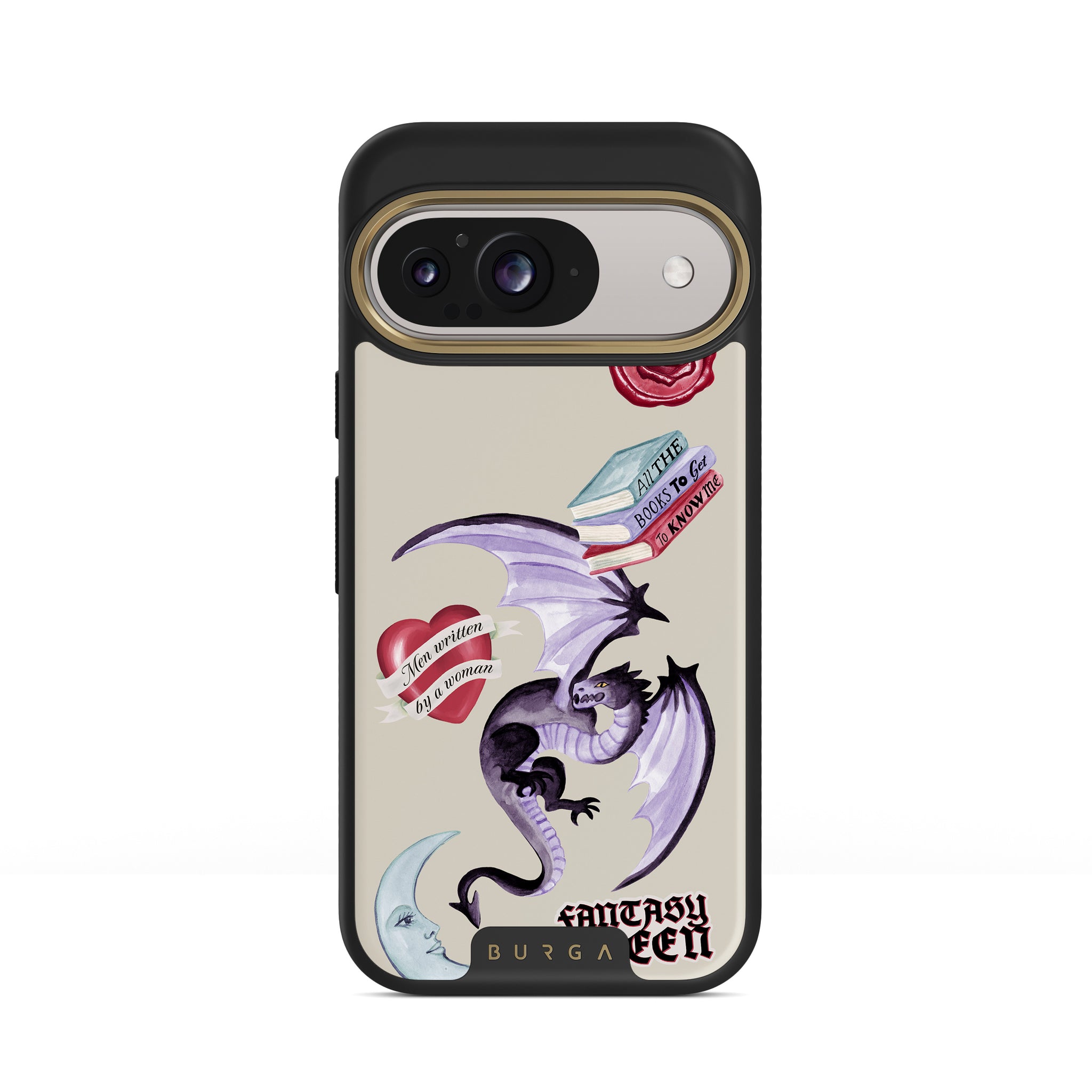 Den här stilen har: lila drake, klistermärke "Fantasy Queen", halvmåne, lila sigill, hjärta med meddelande, böcker.