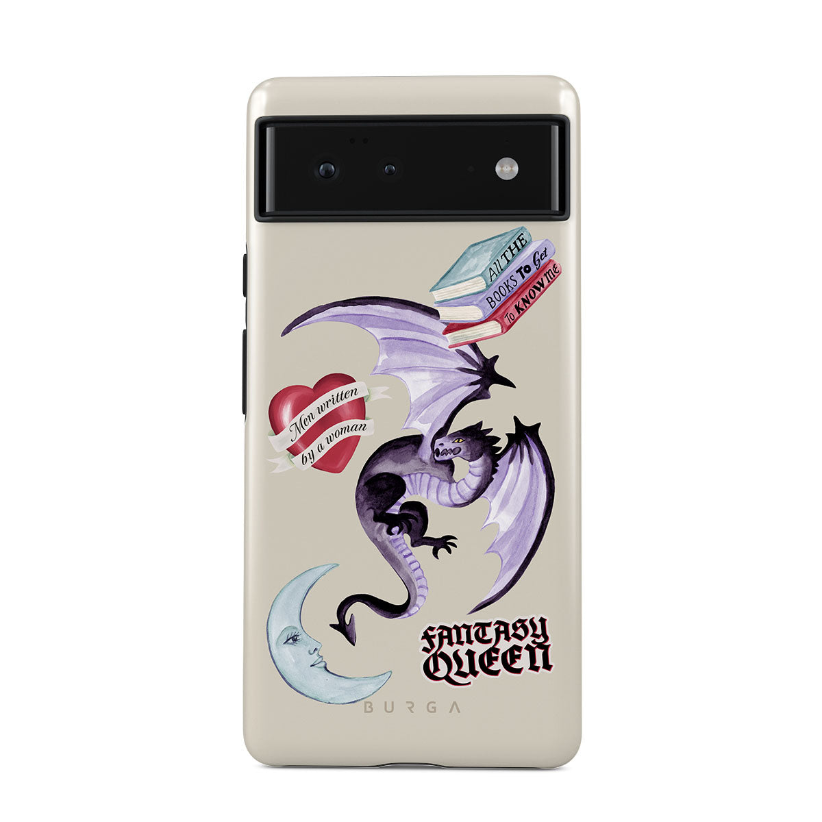Den här stilen har: lila drake, klistermärke "Fantasy Queen", halvmåne, lila sigill, hjärta med meddelande, böcker.
