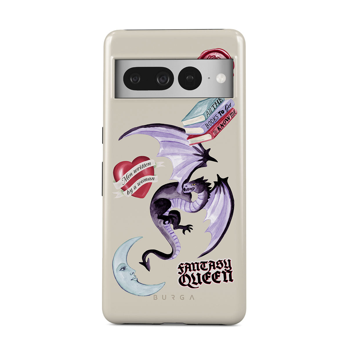 Den här stilen har: lila drake, klistermärke "Fantasy Queen", halvmåne, lila sigill, hjärta med meddelande, böcker.