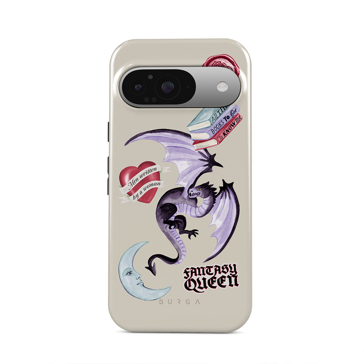 Den här stilen har: lila drake, klistermärke "Fantasy Queen", halvmåne, lila sigill, hjärta med meddelande, böcker.