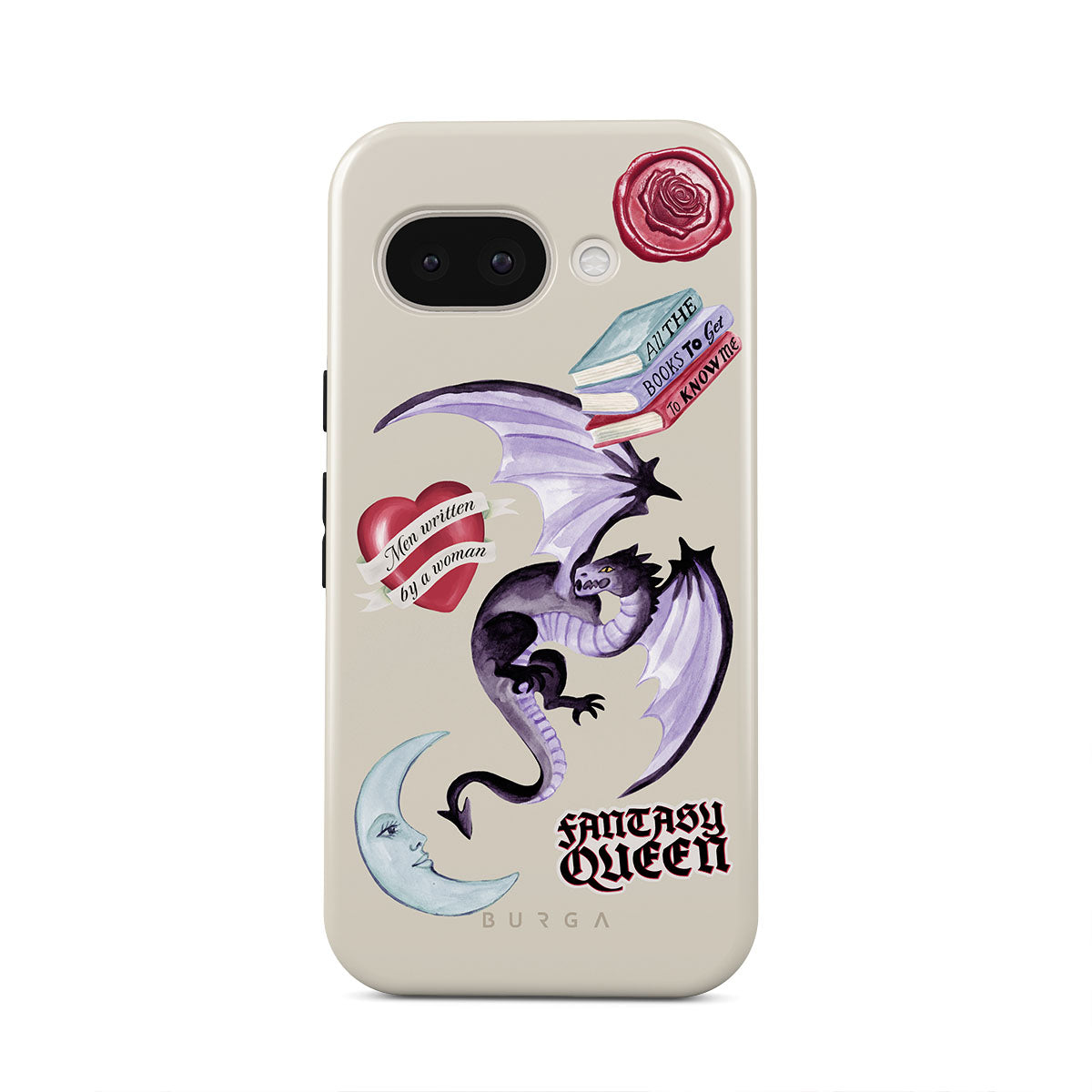 Den här stilen har: lila drake, klistermärke "Fantasy Queen", halvmåne, lila sigill, hjärta med meddelande, böcker.