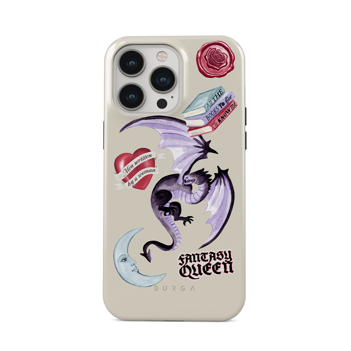 Den här stilen har: lila drake, klistermärke "Fantasy Queen", halvmåne, lila sigill, hjärta med meddelande, böcker.