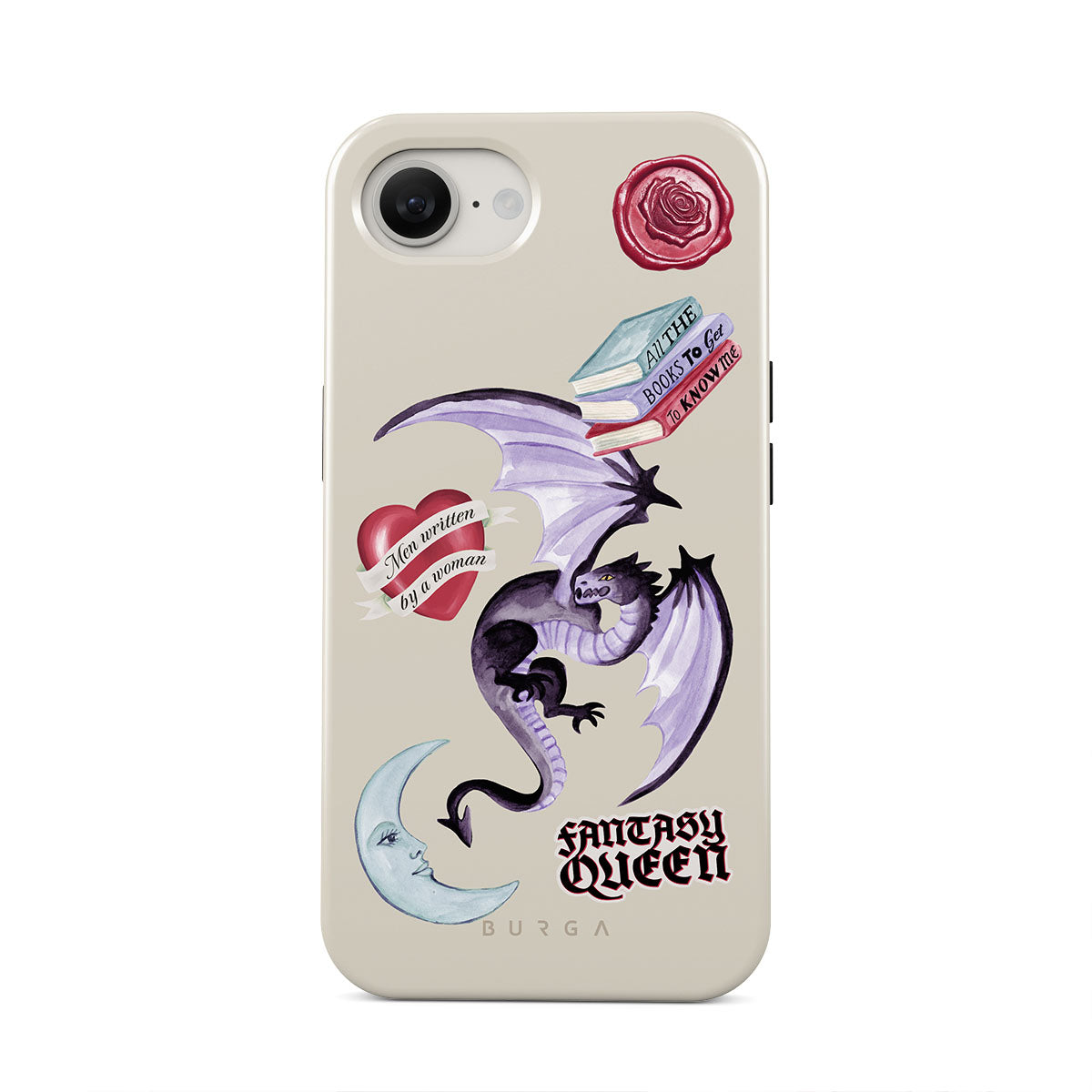 Den här stilen har: lila drake, klistermärke "Fantasy Queen", halvmåne, lila sigill, hjärta med meddelande, böcker.
