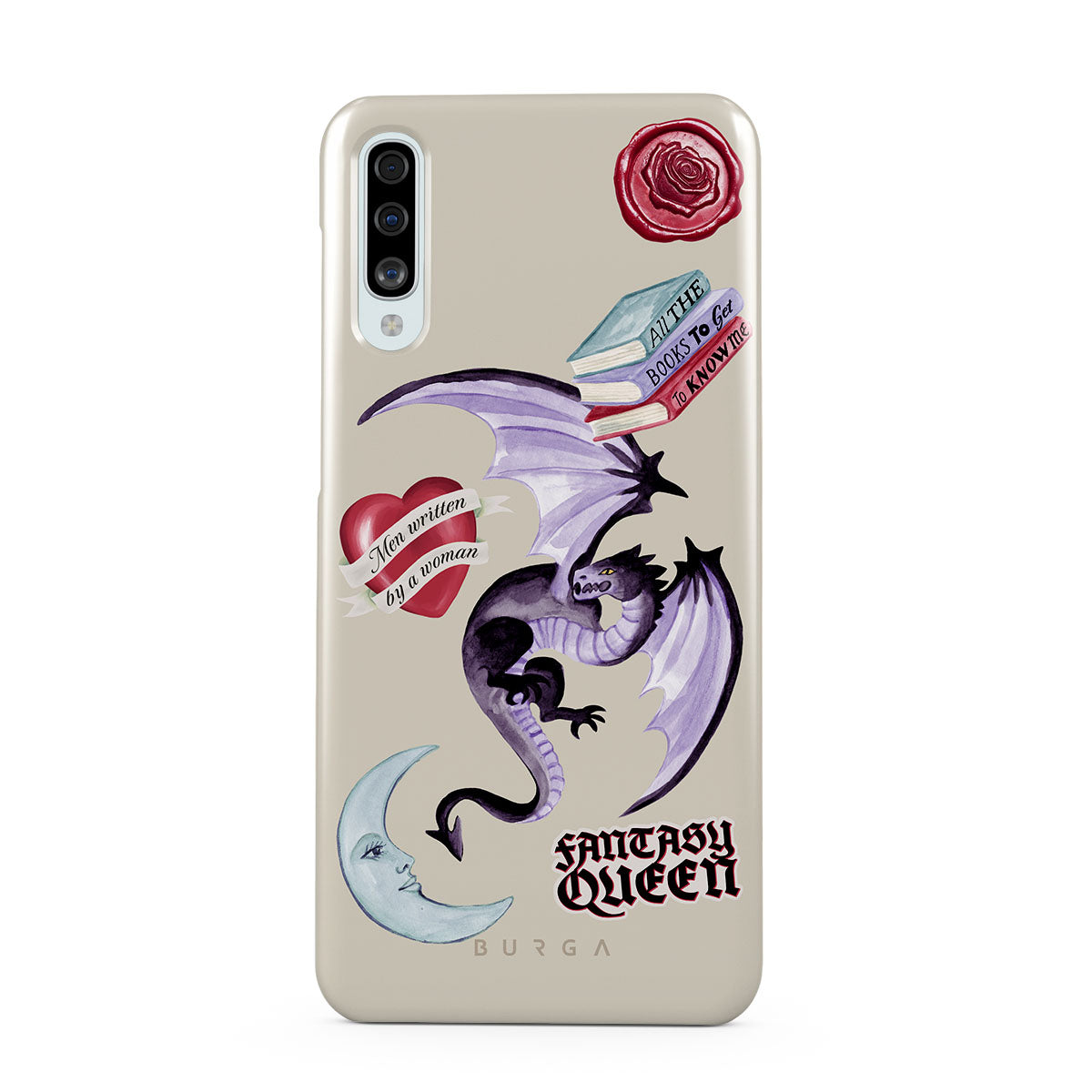 Den här stilen har: lila drake, klistermärke "Fantasy Queen", halvmåne, lila sigill, hjärta med meddelande, böcker.