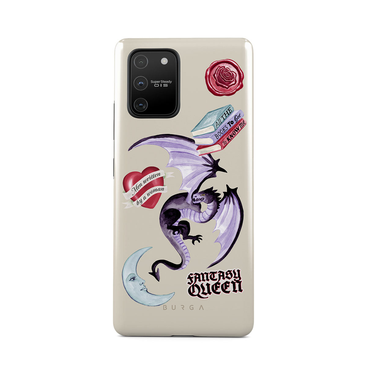 Den här stilen har: lila drake, klistermärke "Fantasy Queen", halvmåne, lila sigill, hjärta med meddelande, böcker.