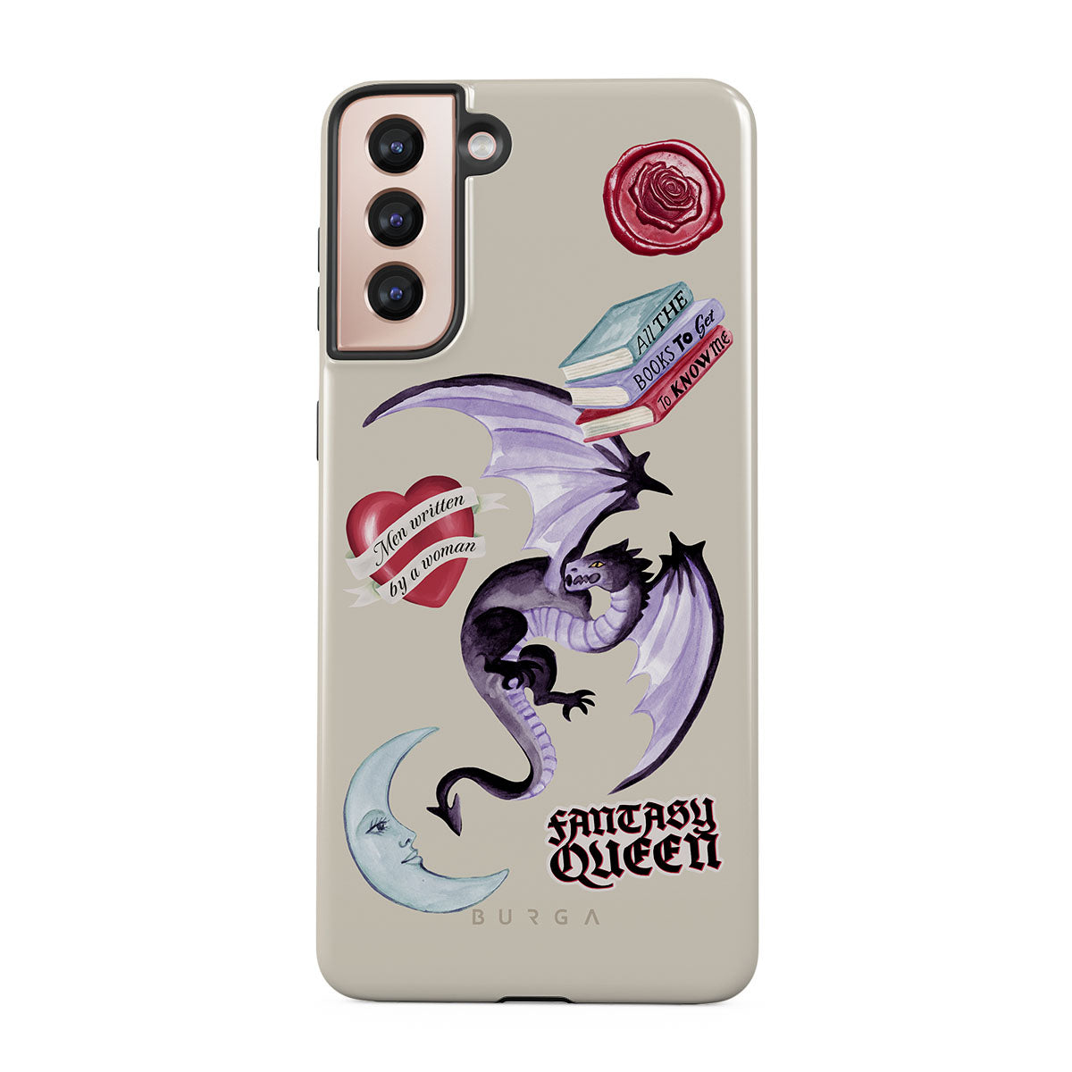 Den här stilen har: lila drake, klistermärke "Fantasy Queen", halvmåne, lila sigill, hjärta med meddelande, böcker.
