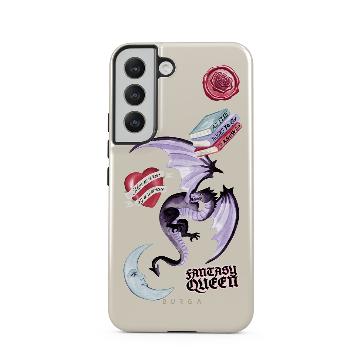 Den här stilen har: lila drake, klistermärke "Fantasy Queen", halvmåne, lila sigill, hjärta med meddelande, böcker.