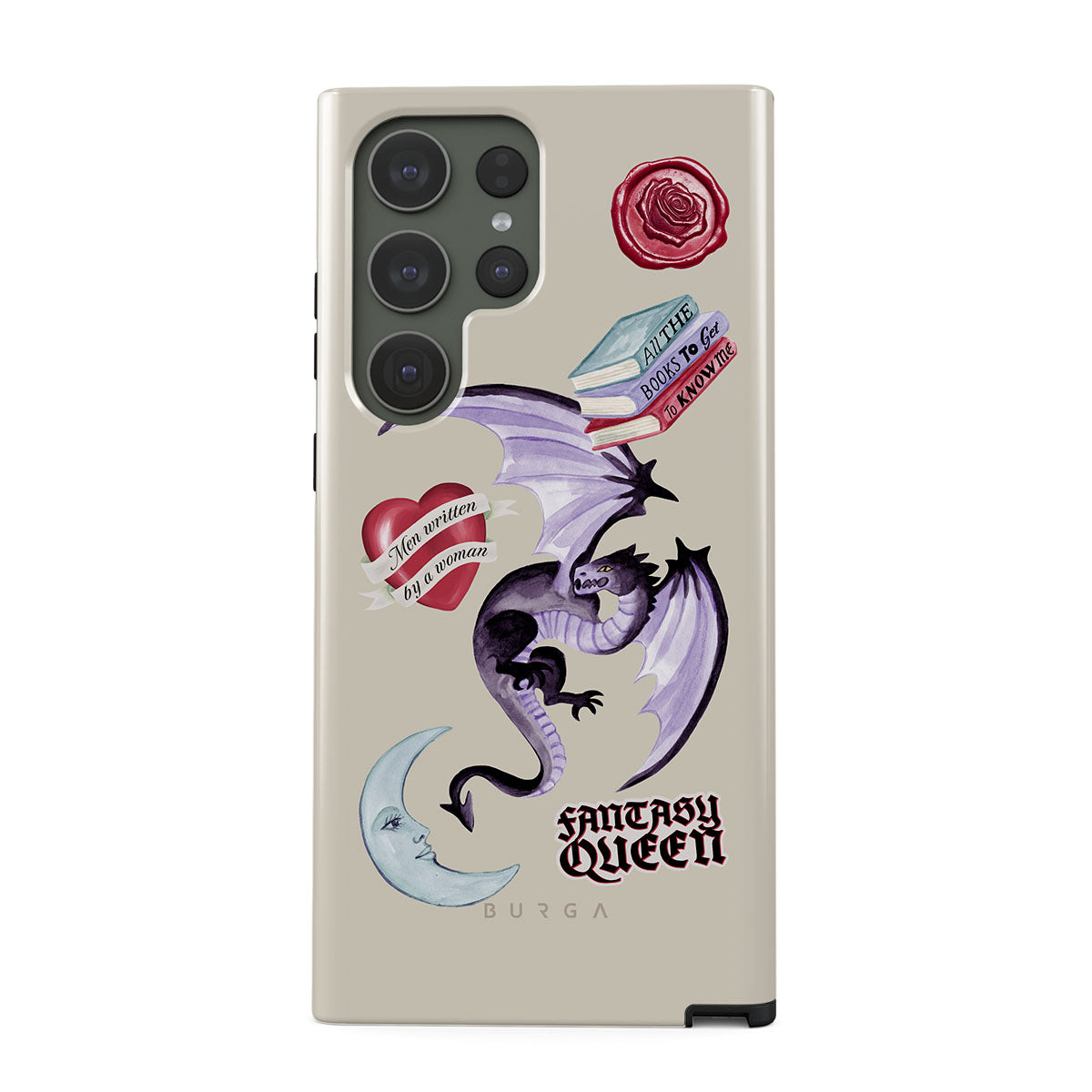 Den här stilen har: lila drake, klistermärke "Fantasy Queen", halvmåne, lila sigill, hjärta med meddelande, böcker.