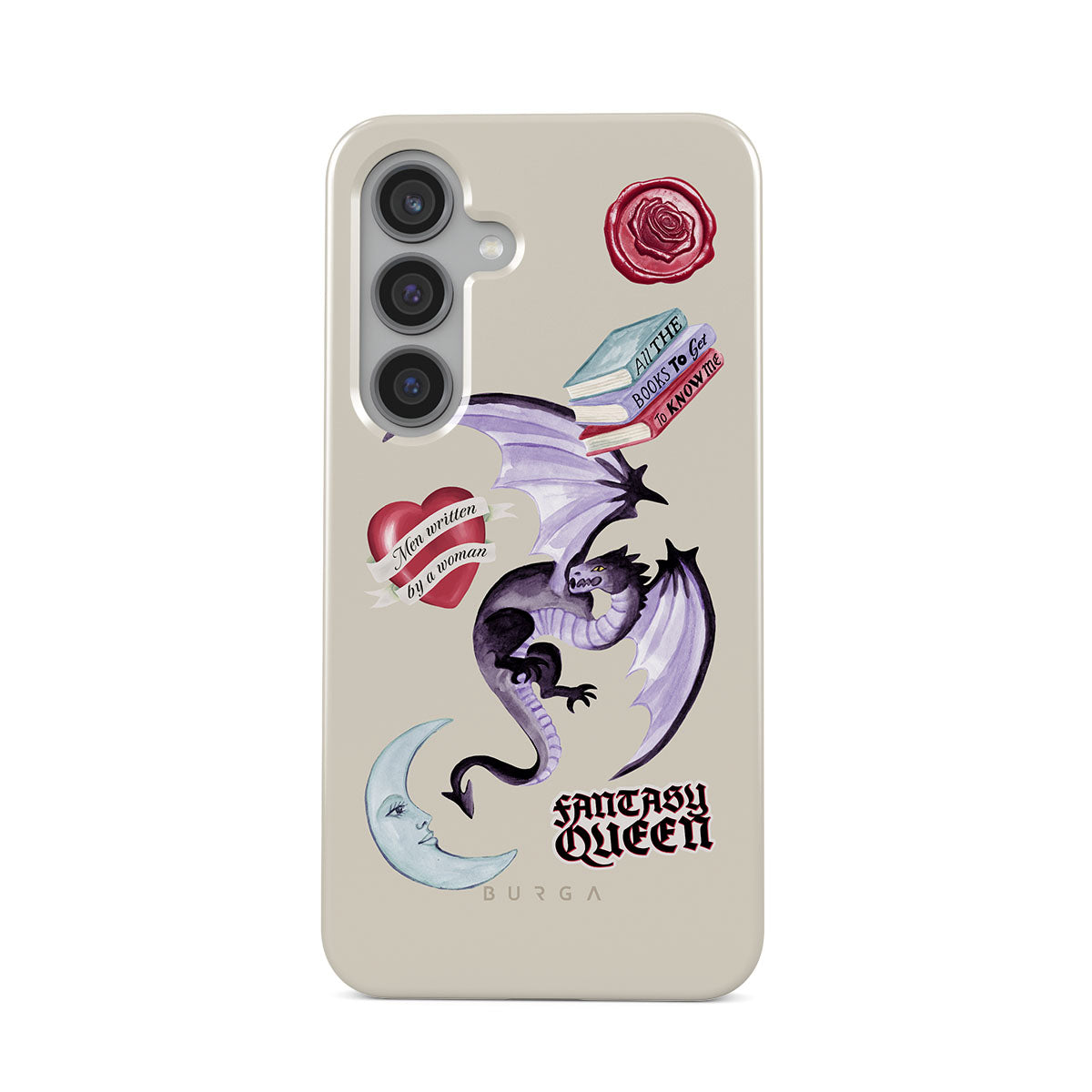 Den här stilen har: lila drake, klistermärke "Fantasy Queen", halvmåne, lila sigill, hjärta med meddelande, böcker.